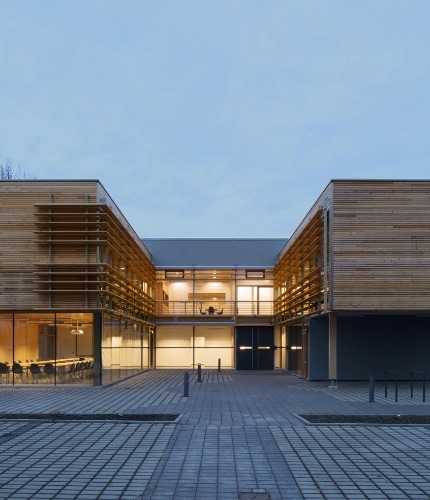 - Fassaden: Pfosten-Riegel-Konstruktion aus Baubuche